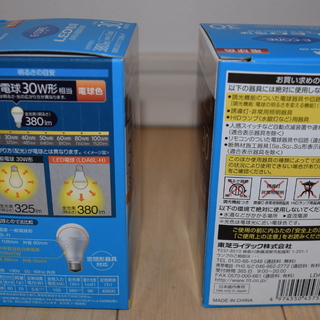 正面の絵は上にあるので、横と背面の写真です。30W型とはいっても、一般電球が全方位に光が広がって325lm (ルーメン)なのに対し、LEDは真横から下方面のみに光が広がり380lmだそうです。つまり一般電球の30W型よりも明るいことが期待できます。