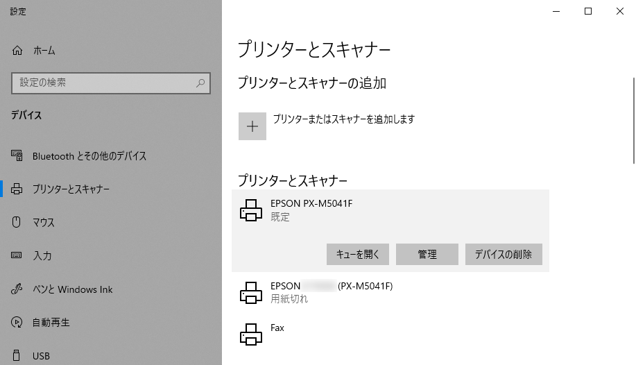 具体的には、上の画面でEPSON PX-M5041Fの「管理」をクリックすると下の画面が出ます。